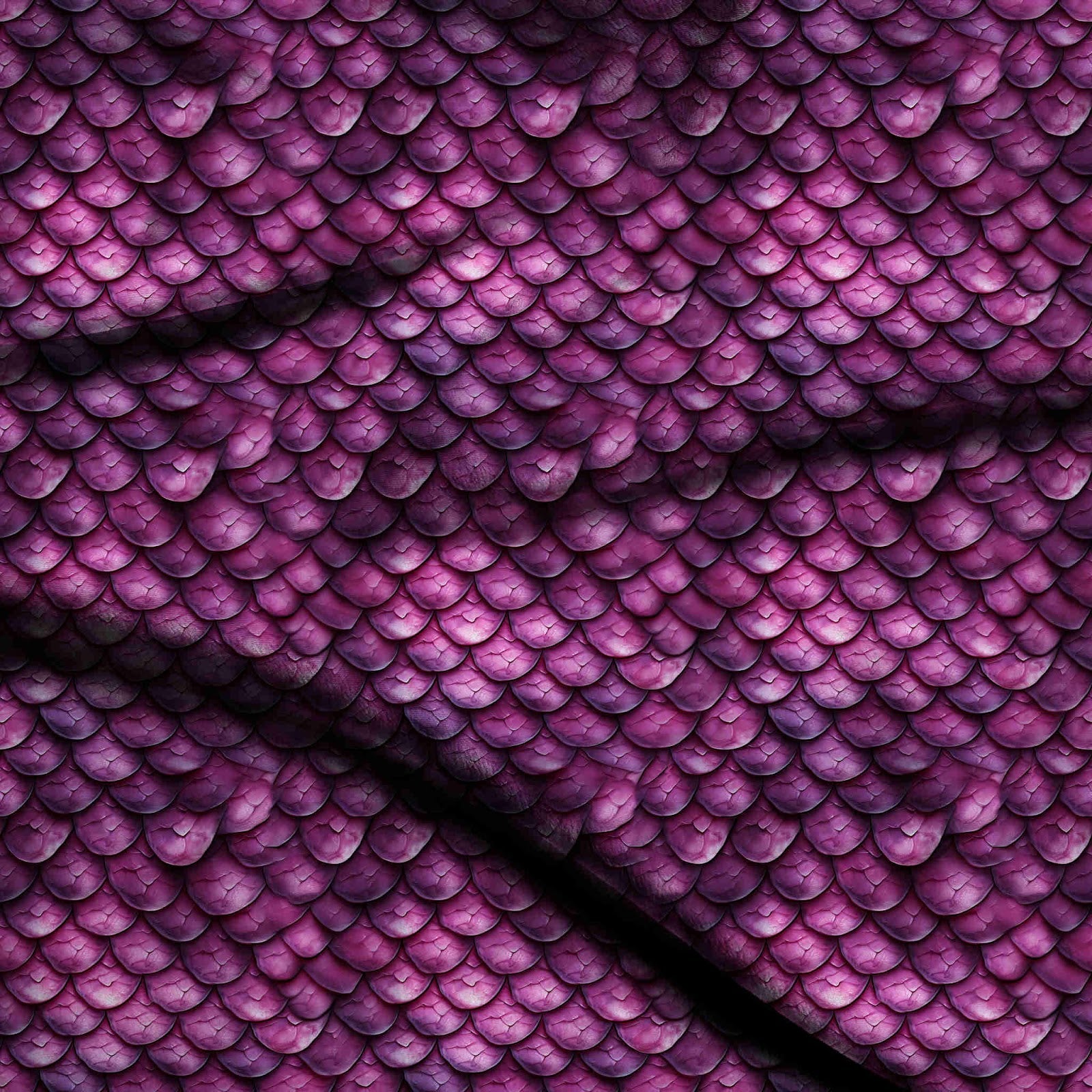 This print features an all-over pattern of overlapping, richly textured scales in deep jewel tones of magenta and purple, reminiscent of a mythical creature's hide. It embodies a mood of dark fantasy and opulent allure, fitting perfectly into a 'Crystal Noir' aesthetic. This fabric would be stunning for dramatic evening gowns, statement jackets, or luxurious accessories that demand attention.