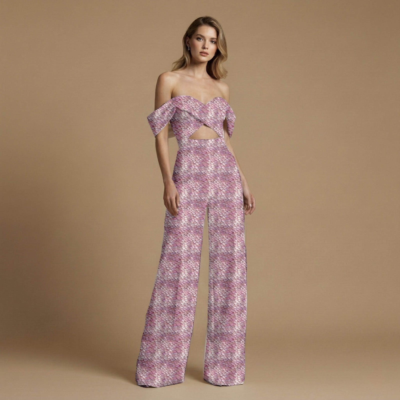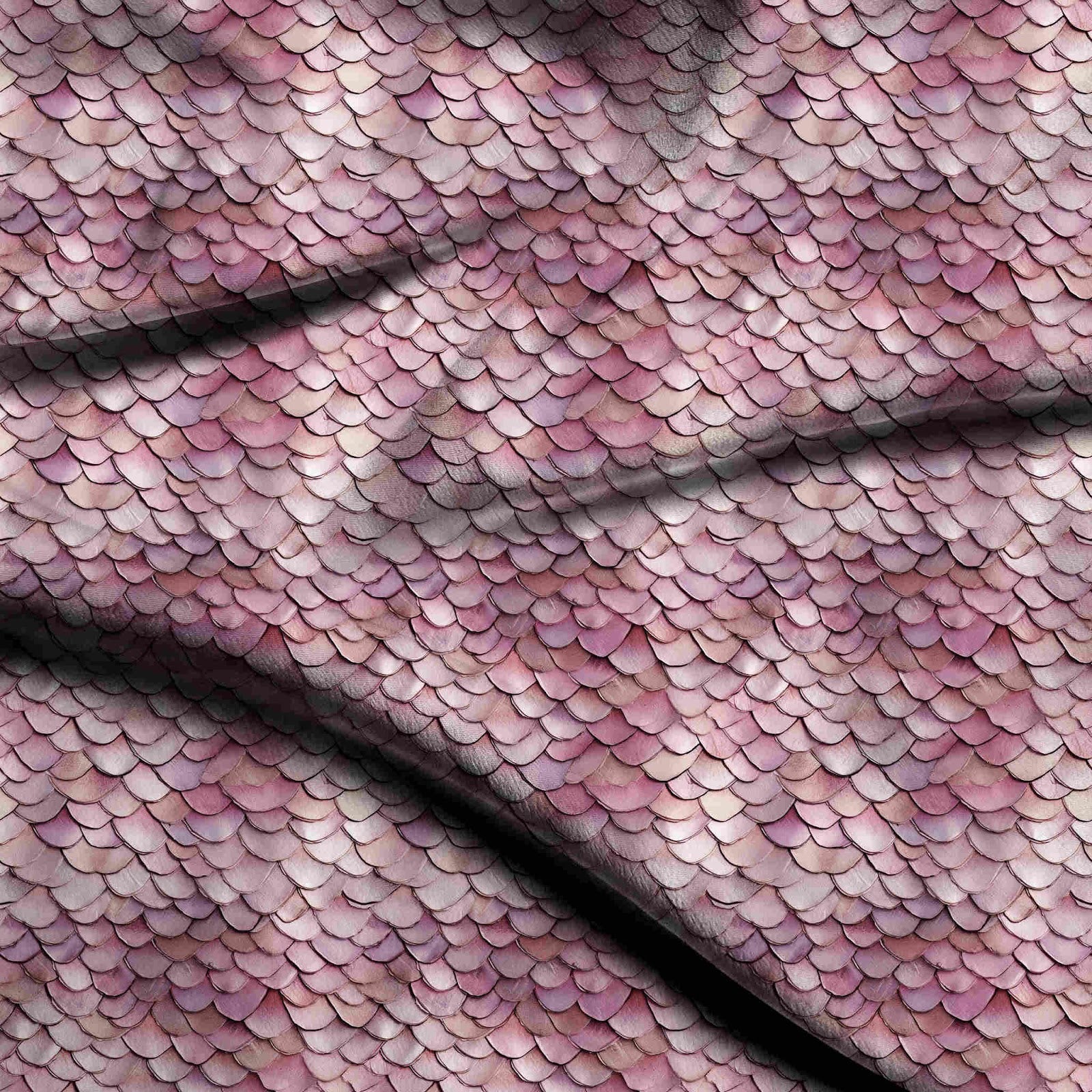 This fabric features an enchanting all-over print of delicate, overlapping scales in a spectrum of dusty rose, pale pink, and ivory cream, with subtle hints of muted violet and charcoal grey. It embodies a whimsical and ethereal mood, perfect for a modern interpretation of a fairy tale aesthetic. This print would be stunning for flowing maxi dresses, elegant saree blouses, or statement lehenga dupattas, ideal for festive occasions or resort wear.